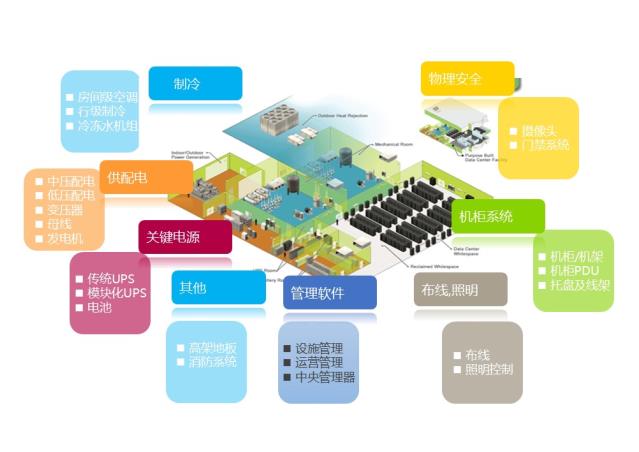 制冷----供配電---關(guān)鍵電源----機(jī)柜系統(tǒng)---布線照明---物理安全---管理軟件---其他