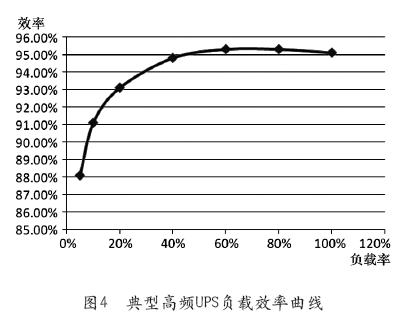 針對(duì)電源變換環(huán)節(jié),傳統(tǒng)數(shù)據(jù)中心采用UPS雙總線供電系統(tǒng),系統(tǒng)架構(gòu)參見圖3。每一路UPS系統(tǒng)均為并聯(lián)冗余系統(tǒng),在實(shí)際應(yīng)用中,UPS并機(jī)系統(tǒng)并機(jī)的臺(tái)數(shù)都不會(huì)太多,一般1+1并聯(lián)或者2+1并聯(lián)情況居多。并聯(lián)冗余系統(tǒng)中,在一臺(tái)UPS設(shè)備出現(xiàn)故障時(shí)系統(tǒng)依然能夠供電,這就要使得每臺(tái)UPS在平時(shí)的單機(jī)負(fù)載率保持較低的水平,如對(duì)于一套UPS(1+1)系統(tǒng)單機(jī)負(fù)荷載最大為50%,(2+1)UPS系統(tǒng)單機(jī)負(fù)載率最大為66%,如果再考慮到負(fù)載的可能突變,系統(tǒng)就必須要保持一定的余度,按系統(tǒng)80%的容量計(jì)算,實(shí)際上每臺(tái)UPS的單機(jī)負(fù)載率最大為40%(1+1系統(tǒng))~55%(2+1系統(tǒng))。參見圖4典型UPS負(fù)載效率曲線,UPS單機(jī)設(shè)備的最佳運(yùn)行效率多數(shù)在90%~94%左右,此時(shí)UPS設(shè)備負(fù)載率為40%~70%之間。供電系統(tǒng)實(shí)際運(yùn)行中,考慮到設(shè)備雙路電源均分負(fù)荷運(yùn)行方式,單機(jī)負(fù)載率區(qū)間為20%~40%,UPS設(shè)備運(yùn)行效率多在80%~90%間。