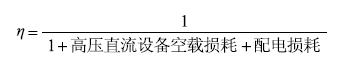 、诠ぷ髂J蕉(主備模式)情況下,市電供電回路側(cè)的電源轉(zhuǎn)換損耗將降低至最低,配電線路損耗略有提高,而高壓直流電源側(cè)將處于空載運(yùn)行狀態(tài),綜合考慮新的雙路供電系統(tǒng)的工作效率比UPS雙總線系統(tǒng)高8%~12%,此時(shí)高壓直流電源設(shè)備的空載損耗將對(duì)整個(gè)系統(tǒng)的效率產(chǎn)生明顯的影響,高壓直流電源設(shè)備的空載損耗越低整個(gè)系統(tǒng)的工作效率越高,工作效率計(jì)算公式為