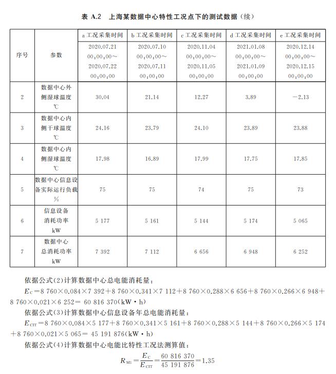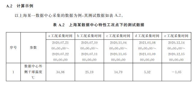 A.3 數(shù)據(jù)中心電能比特性工況法測算值數(shù)據(jù)記錄要求 在公布數(shù)據(jù)中心電能比特性工況法測算值時,應同時披露以下信息: ———數(shù)據(jù)中心所在地理位置,精確到城市; ———測試的具體時段,以及該時段內(nèi)所有有效數(shù)據(jù)點對應的數(shù)據(jù)中心內(nèi)外側干球溫度平均值、濕球 溫度的平均值、信息設備實際運行負載平均值、信息設備消耗功率平均值和數(shù)據(jù)中心總功率平 均值。