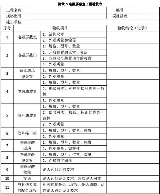 4、電磁屏蔽室工程驗收應(yīng)按《數(shù)據(jù)中心基礎(chǔ)設(shè)施施工及驗收規(guī)范》GB50462-2015附錄G的要求進行和記錄。
