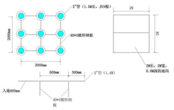 2)在地面挖深約0.8M、長(zhǎng)2M、寬2M地溝,如上圖所示,在如圖所示位置均勻置入9根1.4M長(zhǎng)2”鍍鋅管(入地溝下約600mm),然后在約離地面800mm處、300mm處分別焊接12根40*4鍍鋅鋼板;各接地模塊的極芯互相并聯(lián)或與引下線連接時(shí)采用40*4鍍鋅扁鋼焊接。焊接工藝應(yīng)符合國(guó)家相關(guān)規(guī)范要求。