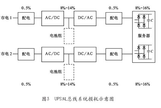 如采用新的雙路供電模式,既采用一路市電、一路高壓直流電源為IT設(shè)備供電,可有效降低UPS設(shè)備的工作損耗。
