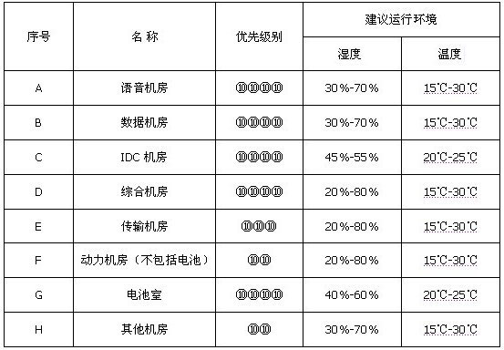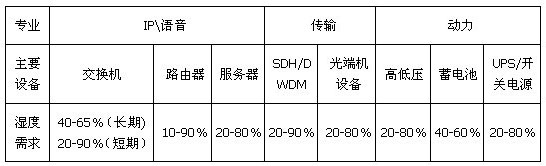 從表中可以得知,除了交換機(jī)(40-65%)和蓄電池設(shè)備(40-60%)需要較高濕度要求外,其他主要設(shè)備工作濕度滿足的要求可以在20-80%之間。