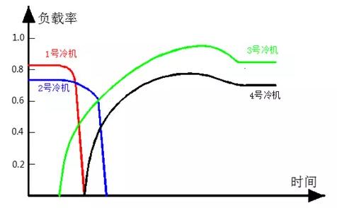 從冷機(jī)負(fù)載率隨時(shí)間變化曲線圖上可以清晰的看到,3號(hào)冷機(jī)啟動(dòng)后其負(fù)載率迅速上升,1號(hào)和2號(hào)冷機(jī)負(fù)載率迅速下降;運(yùn)行一段時(shí)間后,關(guān)閉1號(hào)冷機(jī),開啟4號(hào)冷機(jī),同樣4號(hào)冷機(jī)啟動(dòng)后其負(fù)載率迅速上升;此過程: