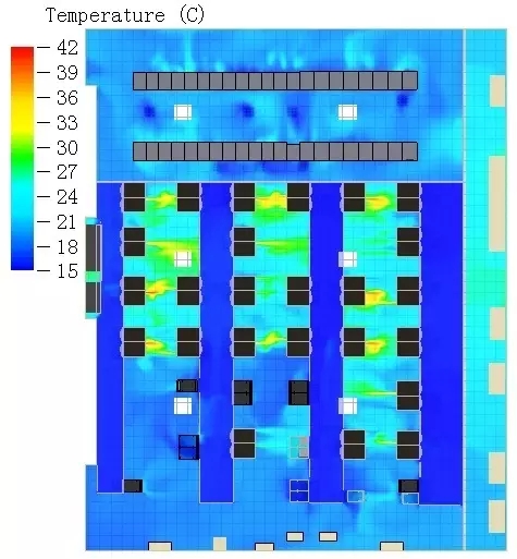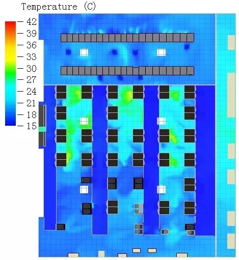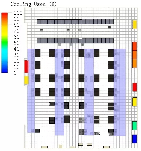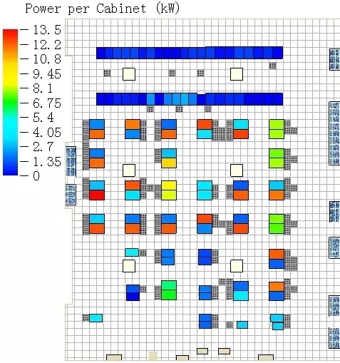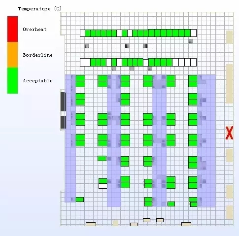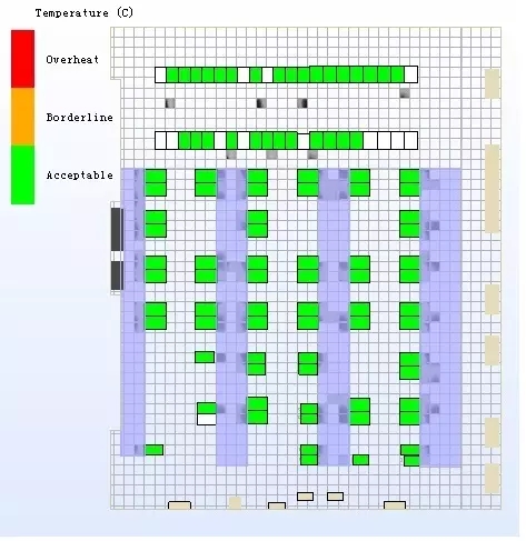 模擬結(jié)果:所有機(jī)柜最高進(jìn)風(fēng)溫度滿(mǎn)足要求,沒(méi)有機(jī)柜處于過(guò)熱或臨近過(guò)熱狀態(tài)。
